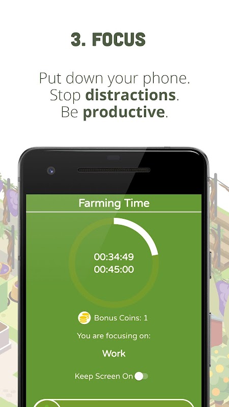Увеличьте свою производительность и оставайтесь сфокусированными на задачах, которые важны для вас! Остановите ваш телефон как источник отвлекающих факторов, создав красивую ферму.