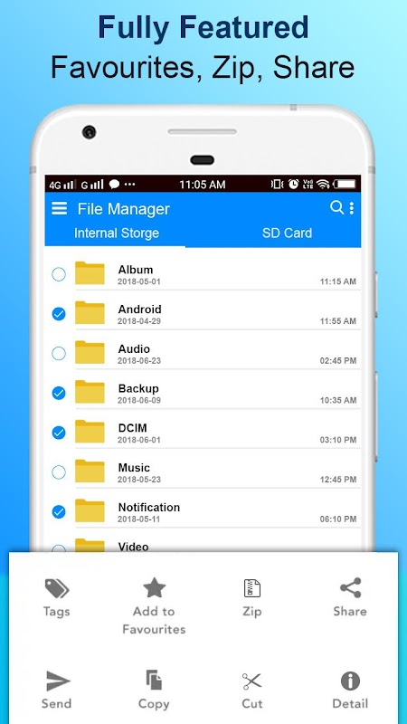 File Manager- select single or multiple files, copy, move, rename, delete, share and other operations, Both SD card and internal storage supported.