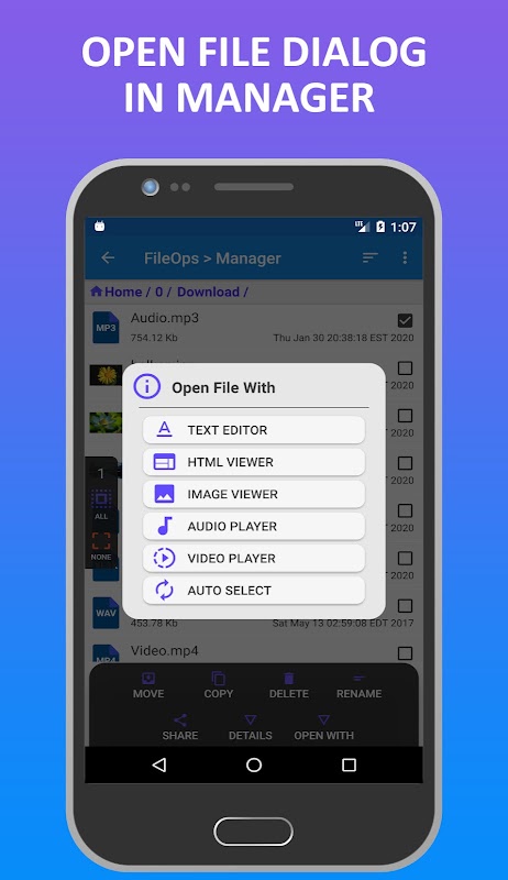 - Открыть с помощью: запускает диалоговое окно для открытия файла; текстовый редактор, средство просмотра HTML, средство просмотра изображений, аудиоплеер, видеоплеер или автоматический выбор