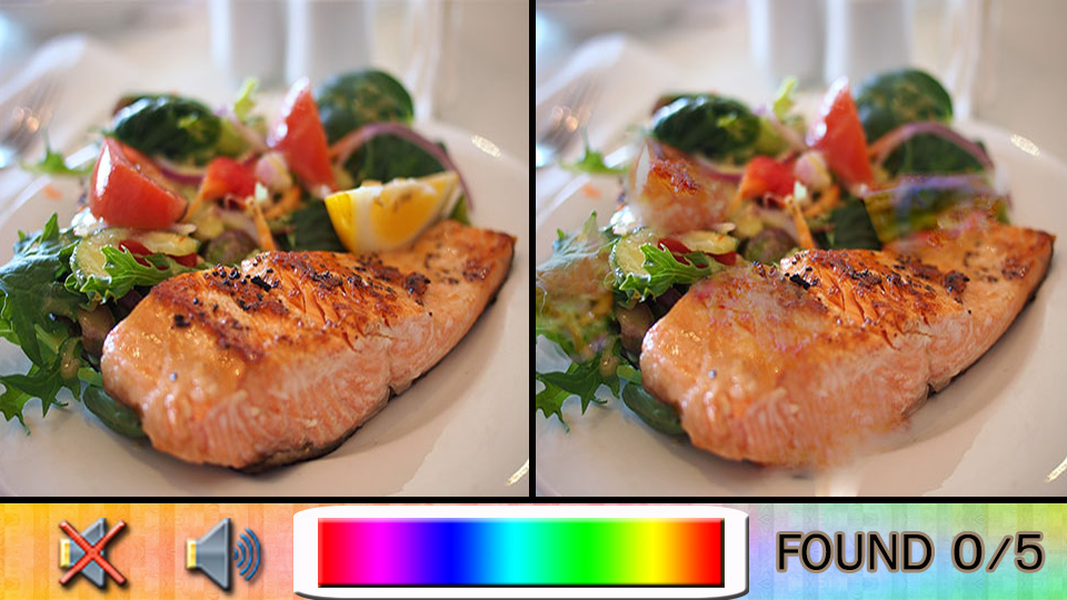 Добро пожаловать, чтобы найти разницу продуктов питания вы будете конкурировать со временем SPOT 5 различий между 2 фотографии. Этот Foodis предназначен для воспроизведения в течение короткого периода времени. Путешествие на поезде? Сидя на автобусе? Стоя в очереди ожидания? Почему вы не получите ваш смартфон из кармана и начать найти блоки отличий.