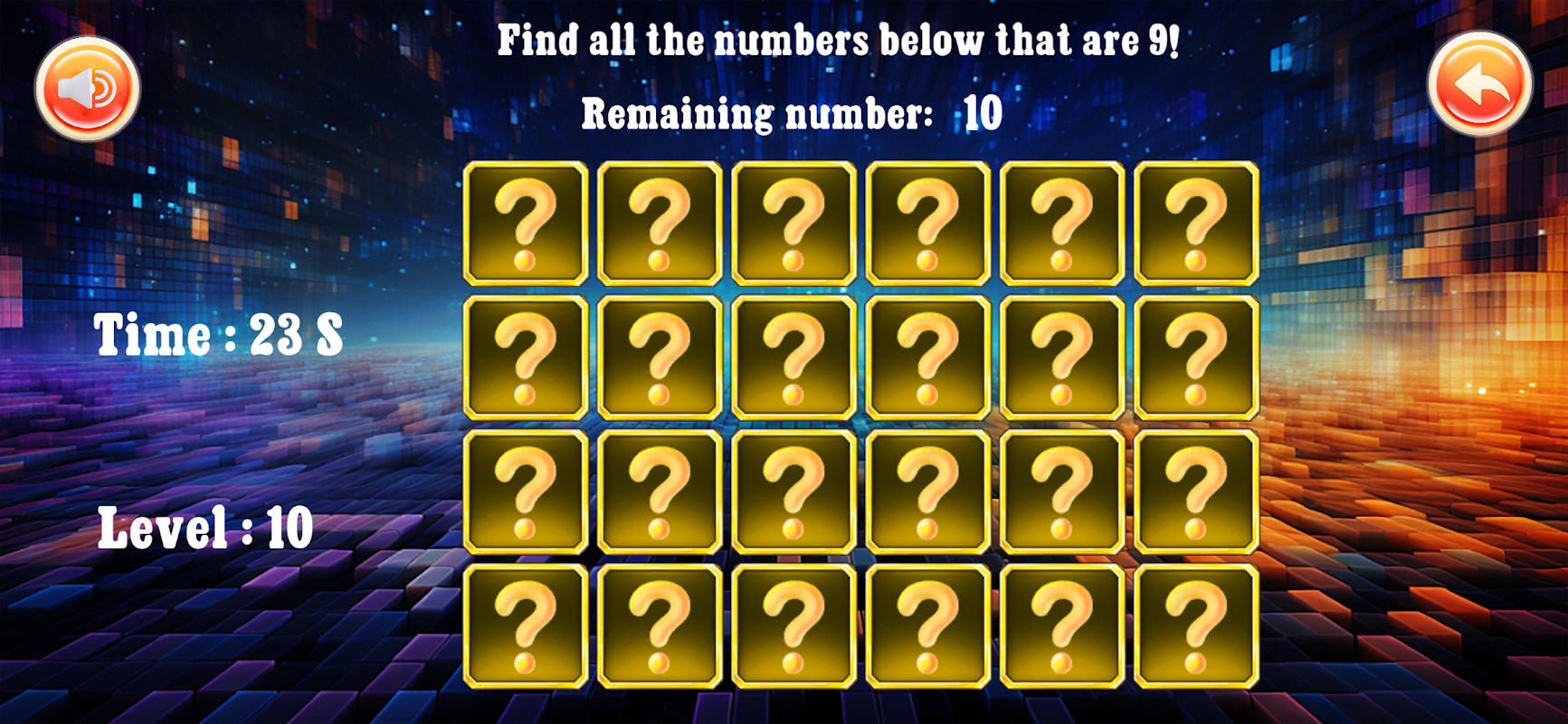 Игра состоит из 4 рядов и 6 столбцов, 24 карточек с числами. Игра начинается с обратного отсчета в 3 секунды, чтобы запомнить положение числа 9. Когда число заблокировано, у игрока есть 30 секунд, чтобы повернуть карточку с числом. Если нажатое число не равно 9, игра заканчивается. Нажмите на все числа 9, чтобы перейти на следующий уровень.