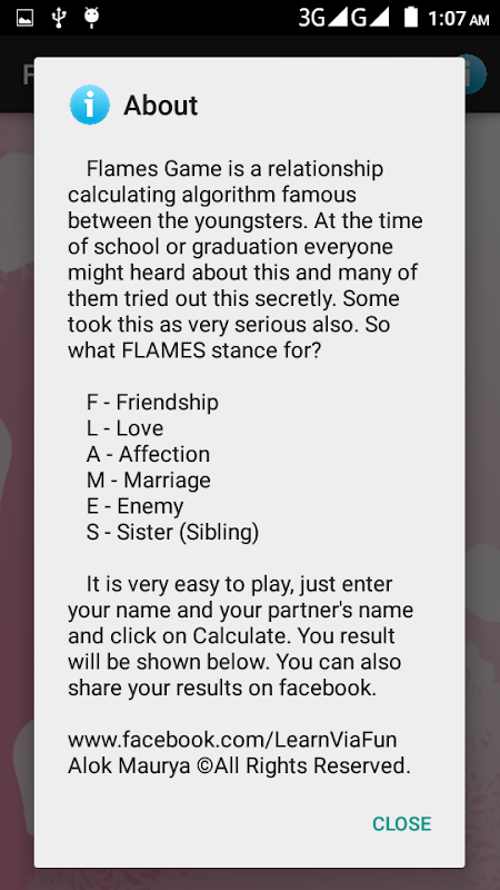 Ниже приведена игра о любви, простой тест на любовь с использованием только имен. Пламя означает Друзья, Любовь, Дело, Брак, Вражда и Сестра.