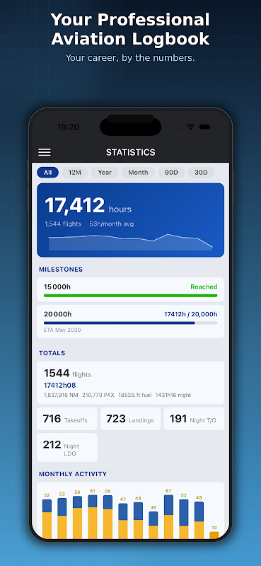 Общий налёт, месячная/годовая статистика, предстоящие рейсы и интерактивная карта мира.