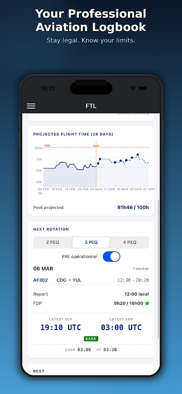 Оценка на основе сна, циркадной фазы, времени на службе и часовых поясов. Интерактивный график, WOCL и прогноз на следующий полёт.