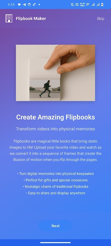 Flipbook Maker — это мощное приложение для Android, которое преобразует ваши цифровые видео в красивые, готовые к печати флипбуки. Оживите магию традиционных флипбуков, превратив ваши любимые видеовоспоминания в физические реликвии, которые вы можете хранить, делиться и беречь вечно.