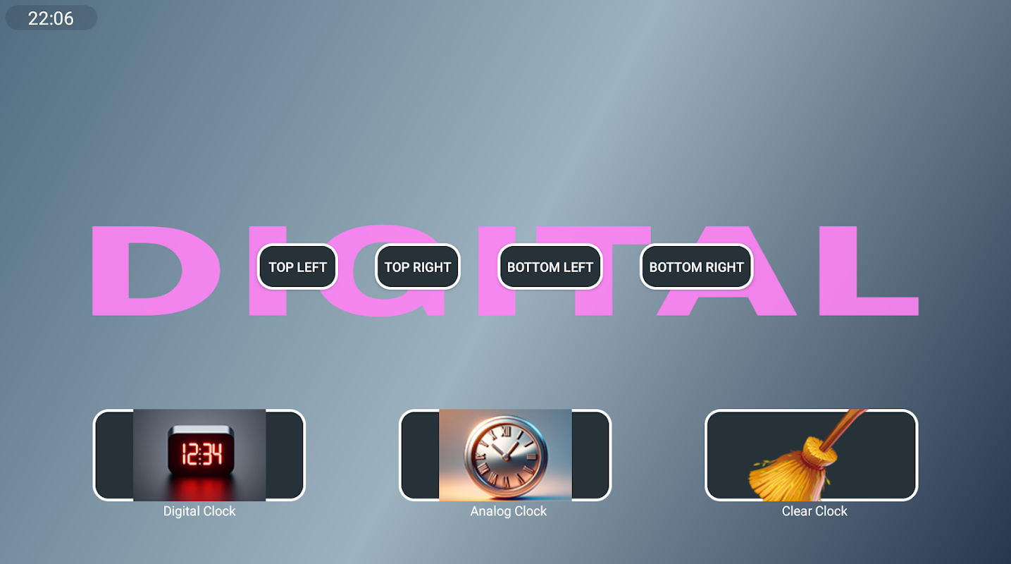 Плавающие часы TV позволяют узнать время в любом месте телевизора. Вы можете выбрать цифровые или аналоговые часы по вашему выбору.