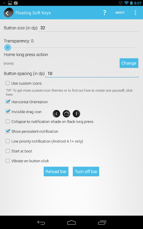 Это приложение делает использование библиотек Standout pingpongboss, чтобы сделать небольшие (и изменяемого размера) софт-клавиши, которые можно перетащить в любом месте на экране. Для устройств с программируемыми клавишами, как по умолчанию навигационного управление, это приложение является наиболее эффективным при использовании в комбинации с CyanogenMod-й или режимом расширенного рабочего стола ParanoidAndroid в.