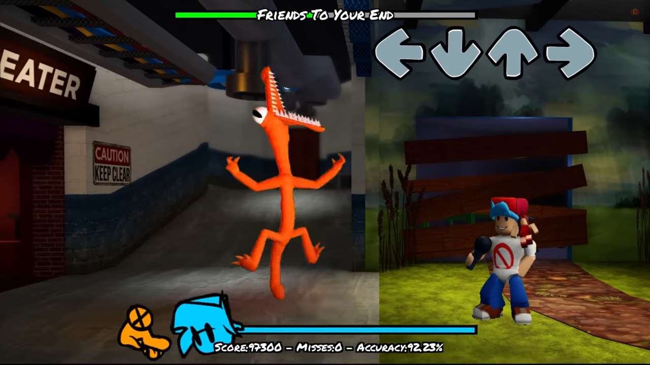 Все, что вам нужно сделать, это идеально нажимать стрелки, когда они совпадают с песней FNF Mod Rainbow Friends, чтобы набрать максимально возможное количество очков и выиграть музыкальную битву в Rainbow Friends Release.