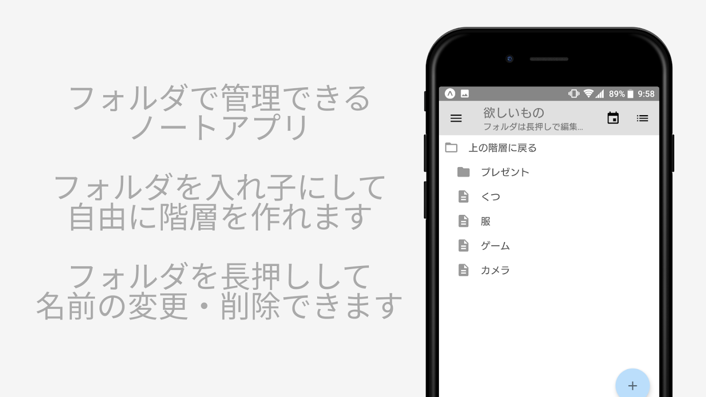 フォルダを作って管理できるノートアプリです。 フォルダを何階層でも作ることができるため、従来のメモアプリより簡単に整理できます。