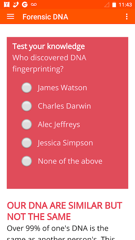 Учебный приложение объясняя, как судебно тестирование ДНК делается и многое другое.