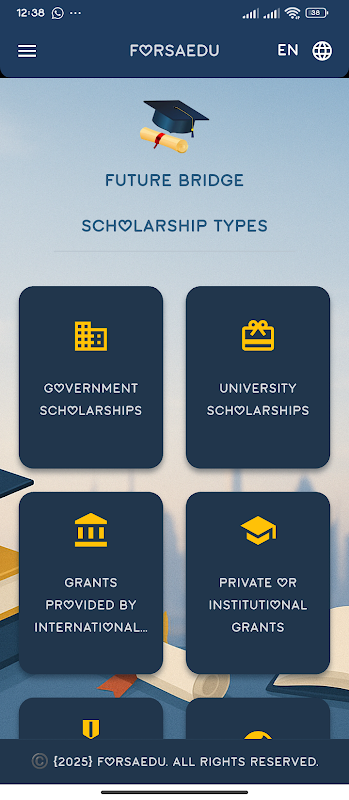 Откройте для себя стипендии, ведущие университеты, бесплатные онлайн-программы обучения и возможности обмена — всё в одном простом и удобном приложении. Независимо от того, получаете ли вы степень бакалавра, магистра или доктора наук, Future Bridge поможет вам найти правильный путь к достижению ваших академических и карьерных целей.
