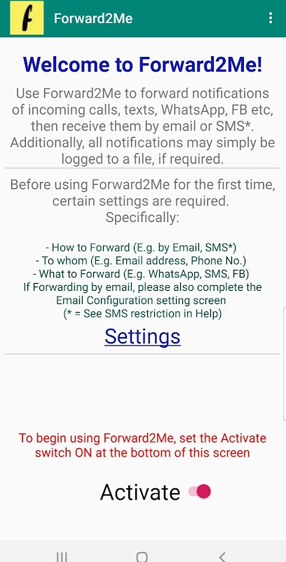 Forward2Me отправляет информацию о входящих вызовах, текстовых сообщениях (SMS), сообщениях WhatsApp и т. д. на ваш адрес электронной почты и/или на другой телефон с помощью текстовых (SMS) сообщений.
