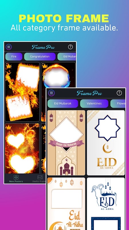 FramePro позволяет создавать потрясающие HD-фоторамки и праздничные постеры всего за несколько касаний. Будь то Ид, Пуджа, День рождения, День Победы, День святого Валентина, Рамадан или Новый год — в FramePro есть специальные категории для каждого случая.