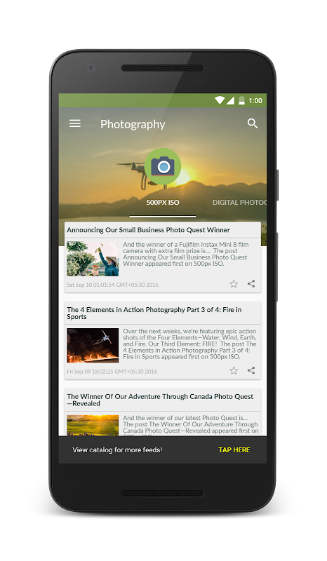 - Default feeds: BBC, Live Mint, Hollywood Reported, Coming Soon, Tech Radar, GSM Arena, 500px, Digital Photography School, Gamespot, Euro Gamer, Cricinfo, Yahoo Sports, Autoblog, AutoCar, Shape.sg, iDiva, Forbes, Reuters.