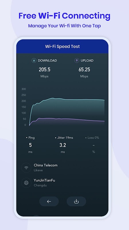Create Free Wi-Fi Connect for Android Portable Hotspot with just one tap you can now speed check, the internet speed meter, with the most accurate report, tests Wi-Fi speed in seconds! Free WIFI Connect - WIFI Anywhere supports speed test of Wi-Fi hotspots and GPRS like 2G, 3G, and 4G. With Wi-Fi speed test and internet speed test that makes you get test results fast, this master version is Lite.