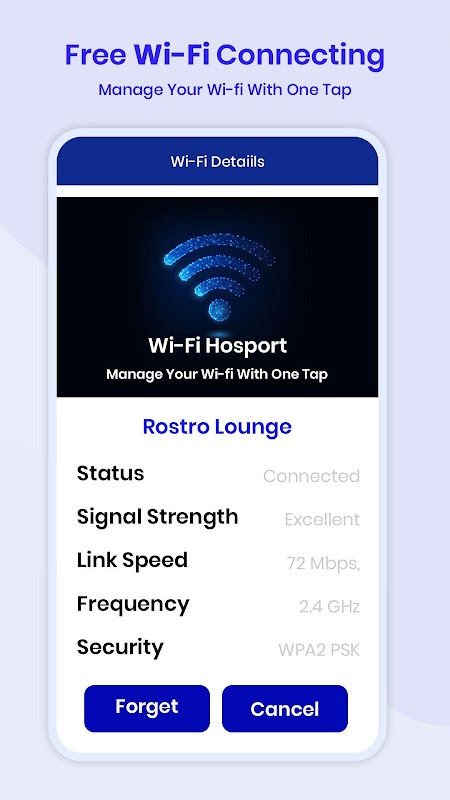Wi-Fi Free Connection Anywhere is the best Wi-Fi scanner, manager. When you look at current Wi-Fi connection, you will see some of the information mentioned above, but also IP address of your device, MAC address, and link speed network. Free Wi-Fi Connect Without Password You can save your data usage and easily by this app. Now available all over the world free Wi-Fi hotspot app for android.