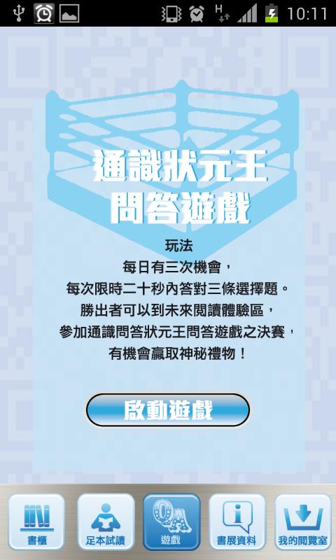 讀者下載程式後,可親臨香港書展「未來閱讀體驗區」,啟動無線閱讀功能,免費試閱電子書,享受「電子打書釘」的樂趣。程式更載有「通識問答狀元王」遊戲,考讀者腦筋和智慧,成功在限時內答對三條題目即可到體驗區參加決賽,爭取成為狀元王,嬴取禮物!
