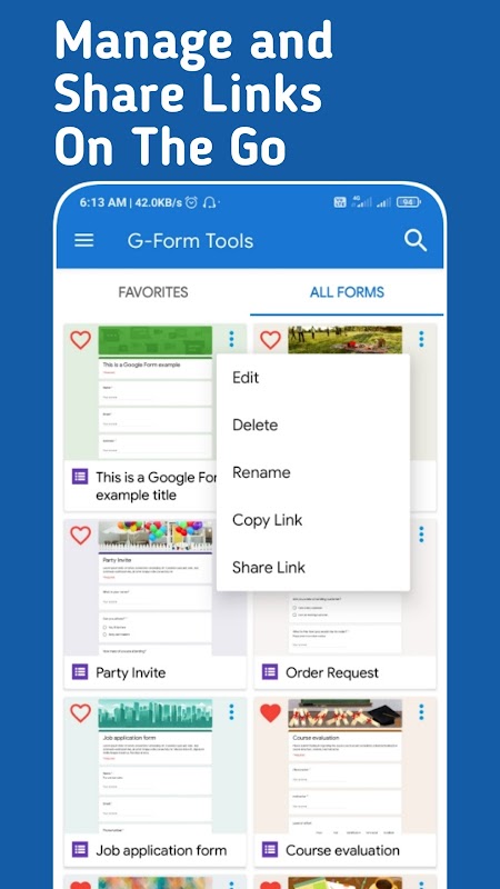 - Сохраняйте неограниченное количество ссылок Google Form в приложении для более быстрого доступа.