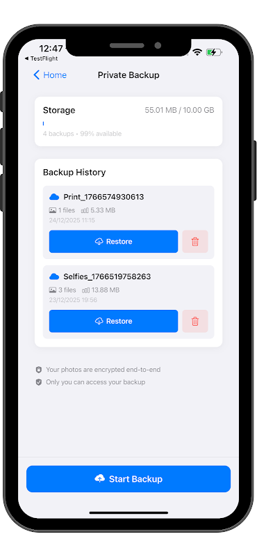 Не бойтесь потерять важные моменты. Перед удалением создайте резервную копию фото в нашем частном зашифрованном облачном хранилище. Восстановить можно в любой момент одним касанием. Ваши фото защищены сквозным шифрованием AES-256.