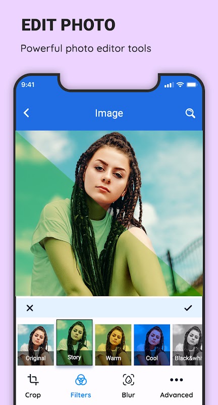 Gallery file organizer and photo album make it easy to edit your pictures on the fly. Crop pictures, flip, rotate, and resize or apply filters you desire.