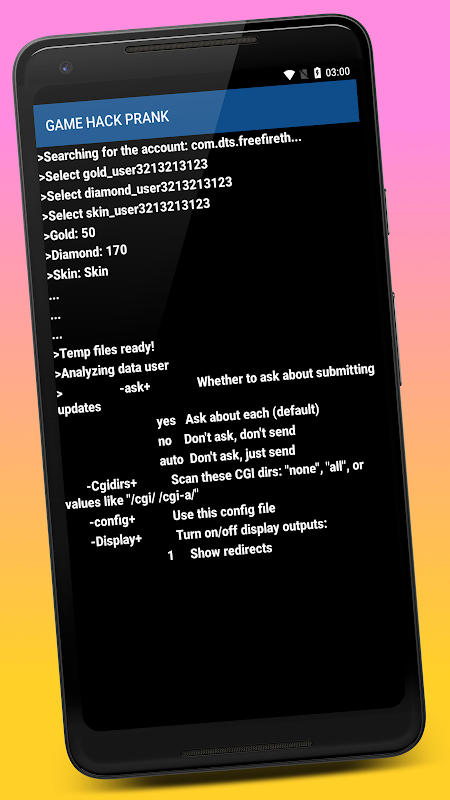 Внимание: приложение Game Hack Tool Prank не является средством безопасности с реальными функциями. Он также не несет ответственности за ошибки, допущенные в результате неправильного использования.