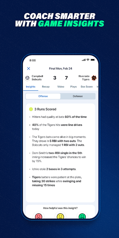 Сбор статистики по бейсболу и софтболу детальный: более сотни метрик, диаграммы подач и отбивания, контроль лимитов питчеров. На их основе GameChanger предлагает рекомендации по составу и помогает распределять защитные иннинги. После матча тренеры просматривают сводки, чтобы корректировать тренировки и роли игроков.
