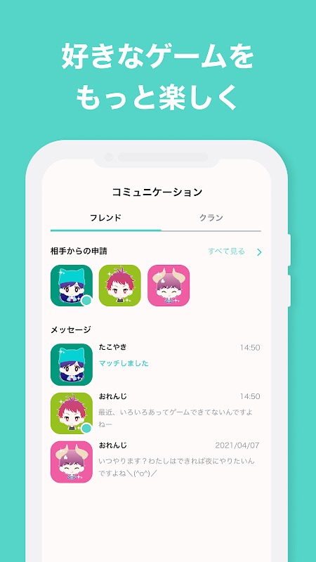 ・ゲームフレンドを探し、メッセージを交換することができます。