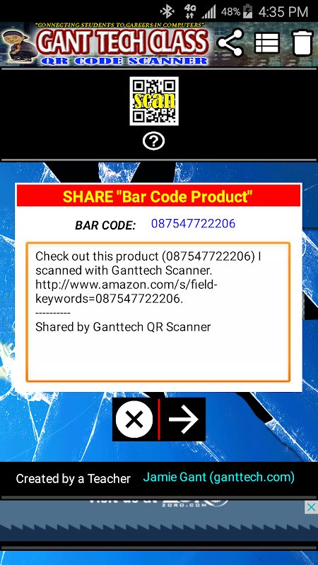 Ganttech Scanner also scans barcodes, and other QR codes. Scanning a Barcode will result with a product search. Scanning any QR code will determine if it is a product, barcode, apk, or website. All QR codes are saved in your history that you can access and share.
