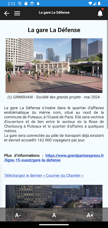 Приложение позволяет следить за последними новостями со строительной площадки Gare La Défense L15 Ouest.