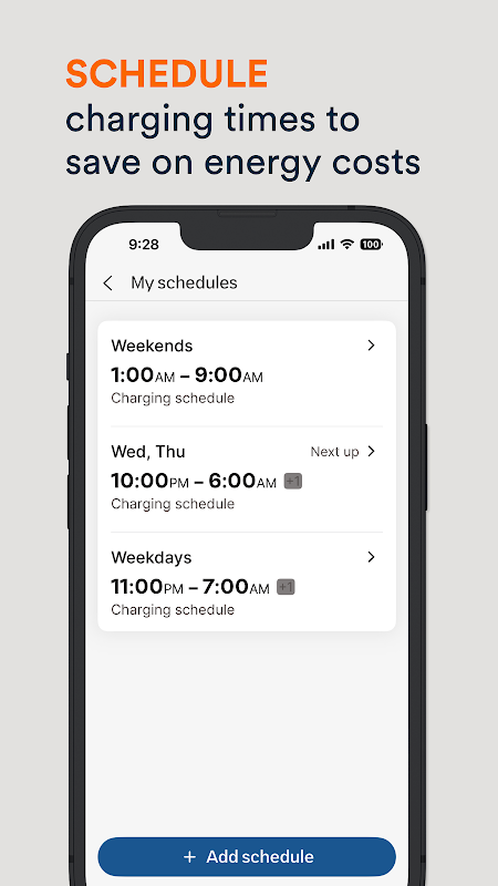 Зарядка по расписанию: установите сеансы зарядки, чтобы сэкономить на расходах на электроэнергию.