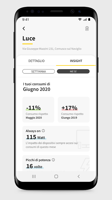 - Раздел потребления позволит вам держать потребление под контролем. Вы сможете проверять прогресс своих пользователей с помощью простых и интуитивно понятных графиков. Если у вас есть счетчик второго поколения, вы также можете просматривать сведения о потреблении света, обновляемые каждые 15 минут.