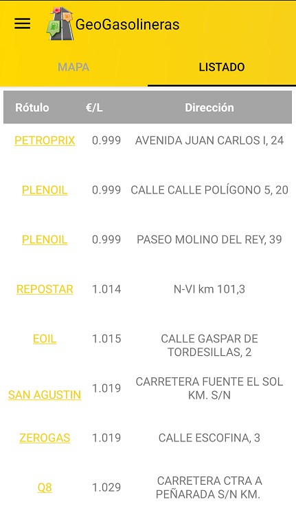 GeoGasolineras переносит на мобильные устройства геопортал АЗС Министерства экологического перехода и демографических вызовов. Его основная цель - предлагать те же цены, что и для станций технического обслуживания на веб-сайте Министерства, размещая их на маршруте, введенном пользователем, или показывая ближайшие к их местоположению. Очень интуитивно понятным и наглядным способом он позволяет осуществлять географический поиск станций технического обслуживания по всей территории Испании.