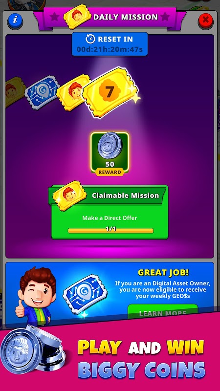 Complete the Daily Missions and win fabulous prizes every day! Win Biggy Coins and trade them for a free NFT.