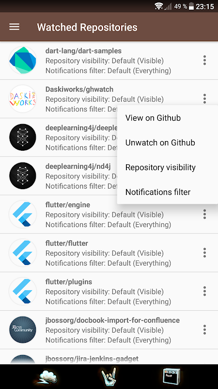 Приложение периодически проверяет сервер GitHub на наличие новых уведомлений и запускает уведомление Android с настраиваемым звуком и вибрацией, чтобы предупредить вас. Вы можете отобразить список непрочитанных уведомлений GitHub, отфильтровать их по репозиториям, пометить одно или все уведомления как прочитанные, отключить звук выбранной цепочки уведомлений или просмотреть подробную информацию об уведомленном событии. Вы также можете отобразить список просматриваемых репозиториев, установить фильтр для типа уведомлений, о которых вы хотите получать оповещения, отменить их просмотр или просмотреть подробную информацию. Подробная информация отображается на веб-сайте GitHub (который удобен для мобильных устройств) или с помощью официального приложения GitHub для Android, поэтому вы видите всю необходимую информацию и выполняете отдельные действия (например, ответ в обсуждениях и т. д.) напрямую.