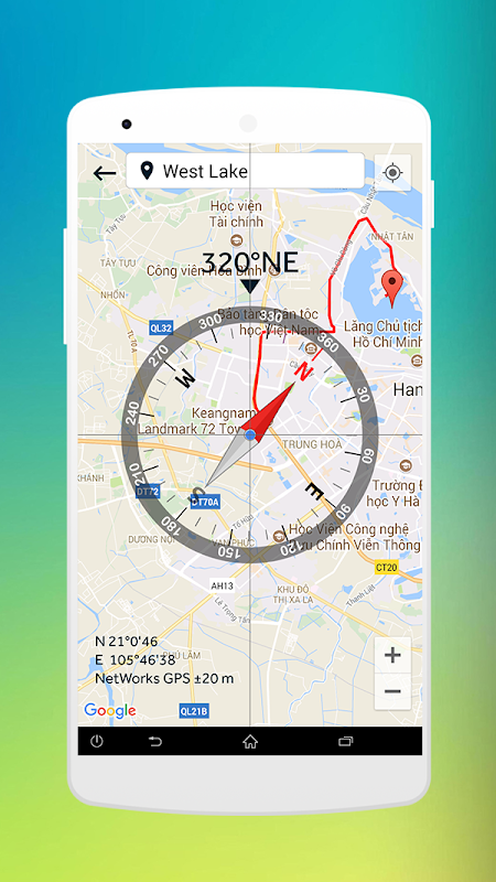 - Gps компас навигация - настоящий компас, который показывает ориентацию устройства в реальном времени на магнитные поля с помощью компаса сенсора, карты Google и навигации GPS.