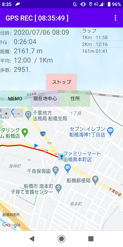 このアプリはスマホのGPS機能を利用して走行ルートや距離・走行時間を記録するものです。