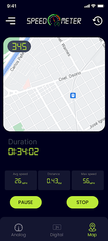 Приложение, разработанное с чистым темным интерфейсом и профессиональными индикаторами, предоставляет точные данные о скорости, а также информацию о продолжительности поездки, расстоянии и отслеживании на карте.