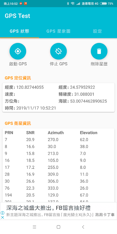 Может отображать значение SNR GPS и вид со спутника.
