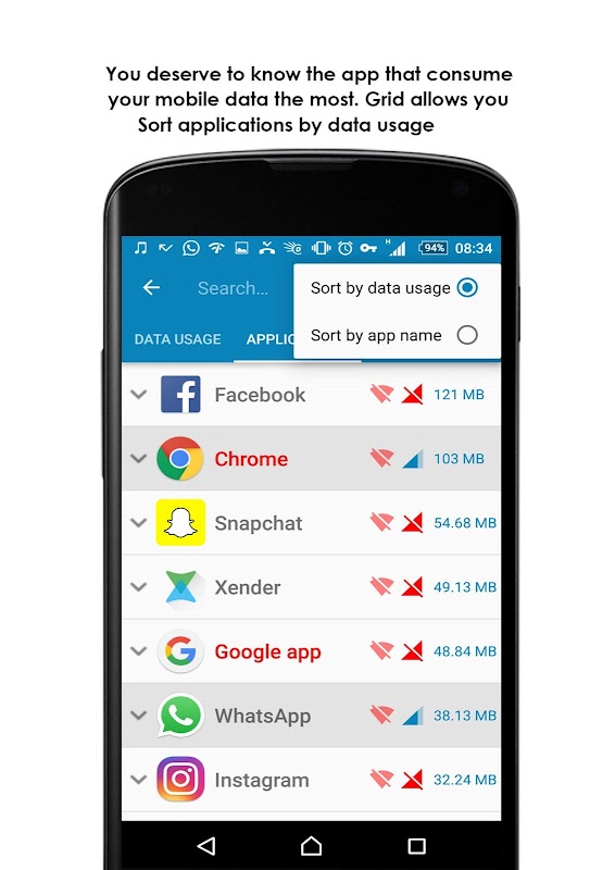 * Определите, что потребляет мобильных данных: Вы не должны позволять какой-либо доступ приложение мобильных данных без разрешения. Сетка Data Manager экономит ваши мобильные данные, давая Вам полный контроль над всеми приложениями (установлены / системы) в вопросах доступа мобильных данных. Только необходимые приложения будут иметь возможность получить доступ к мобильной передачи данных.