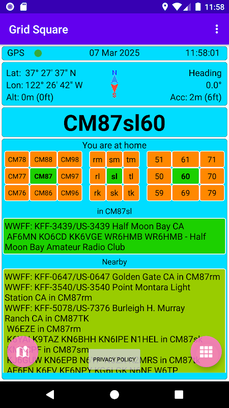 Приложение Grid Square отображает 8-значное значение Grid Square Locator (также известное как Maidenhead Locator, QTH Locator), рассчитанное на основе географических координат, полученных со спутников GPS и мобильной сети.