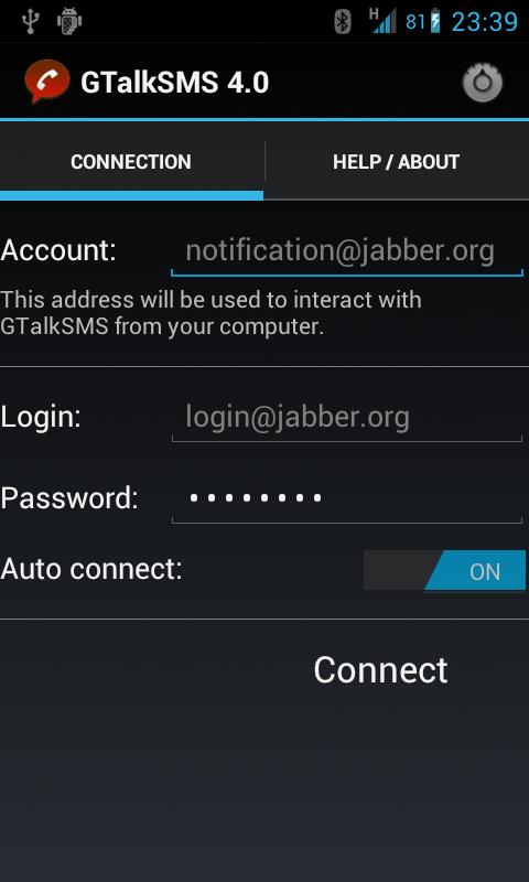 Note: GTalkSMS is not a chat client, its a service on your android phone that connects to GTalk/XMPP and waits for special commands and informs a GTalk/XMPP account about new SMS Messages / Incoming Calls / Battery State / etc.