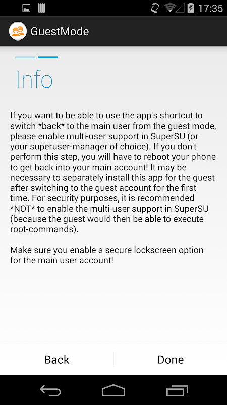 If you want to be able to use the app's shortcut to switch *back* to the main user from the guest mode, please enable multi-user support in SuperSU (or your superuser-manager of choice). If you don't perform this step, you will have to reboot your phone to get back into your main account! It may be necessary to separately install this app for the guest after switching to the guest account for the first time. For security purposes, it is recommended *NOT* to enable the multi-user support in SuperSU (because the guest would then be able to execute root-commands). Make sure you enable a secure lockscreen option for the main user account!