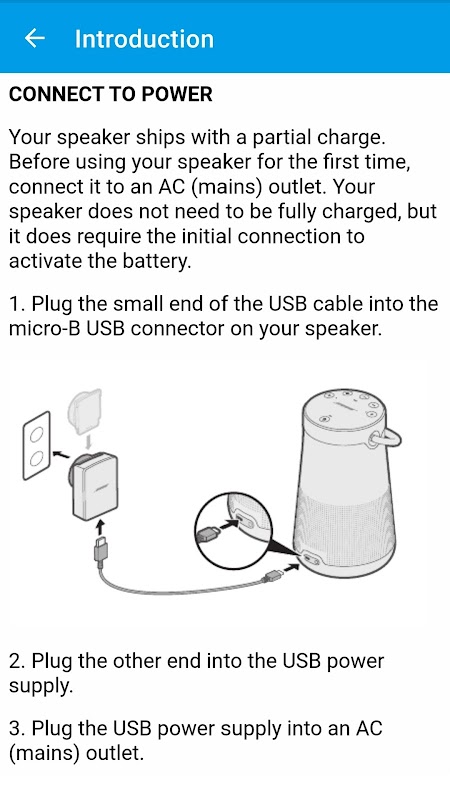 Мобильное приложение содержит информацию о колонке Bose; технические характеристики, введение, подключение устройства, проводные подключения, обновление, сброс настроек и руководство по устранению неполадок. Это приложение представляет собой руководство с информацией о динамике Bose Revolve.