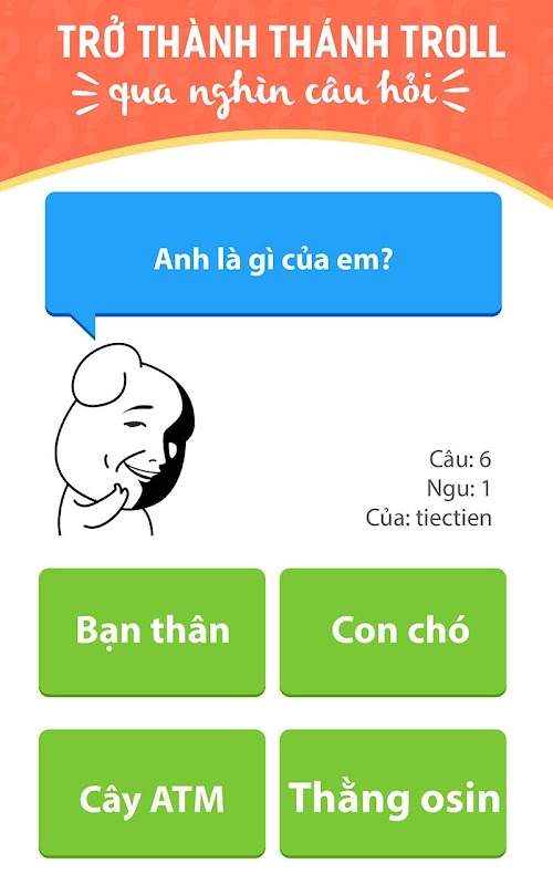 Hỏi ngu - Hỏi Tí - Đáp Troll (Hoi ngu - Hoi Tí - Dap Troll) là game troll với kho câu hoi ngu vô cùng đa dạng giúp bạn rèn luyện khả năng hoi dap ứng biến với những câu hỏi ngu để trở thành thánh troll khi bị hỏi troll.