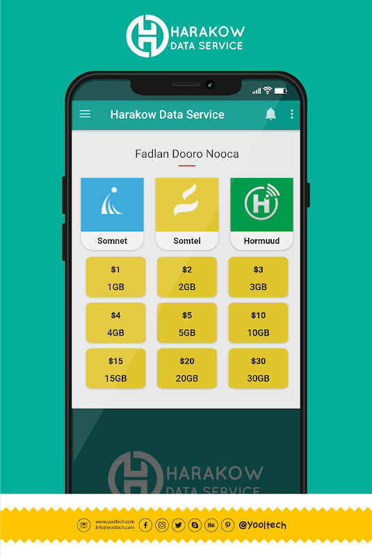 Waxaad ka iibsan kartaan xirmooyinka Somnet iyo Somtel Hormuud. Hada kadib uma baahnid in aad cid la hadashid ama qarash telefan ku bixisid si laguugu shubo xirmo SomNet hadii aad isticmaashaan Harakow Data app. Sidoo kale ka waxaad ka heli doontaa Adeegyada EVC Plus, ANFAC iyo Artimet