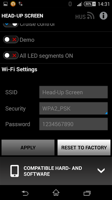 The Head-Up Screen app allows you to set the settings of the installed Head-Up Screens Accessory product through wireless network.