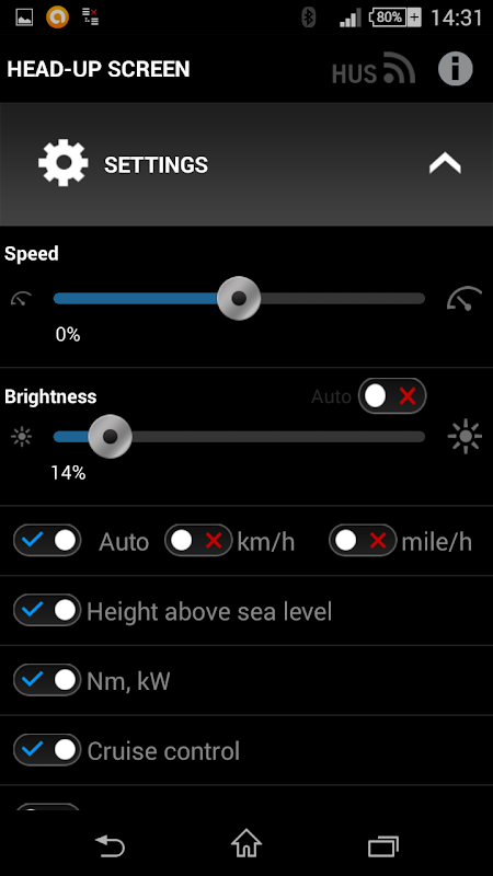 С ГУС приложение, вы можете изменить настройки вашего Head-Up аксессуар экрана