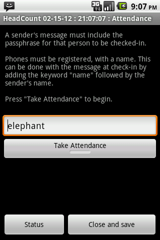 The easy way to take attendance. Each student sends an SMS text to your mobile device. If the text contains the passphrase you specify, they are checked in.