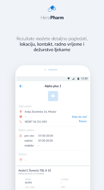 Koristeći aplikaciju HeraPharm, у вас есть тренерская су вам вам на доступ к информации о людях и судьбе. Tu su i opće informacijeje o ljekarni, Radno vrijeme, dežurstvo, kontakt and lokacija.