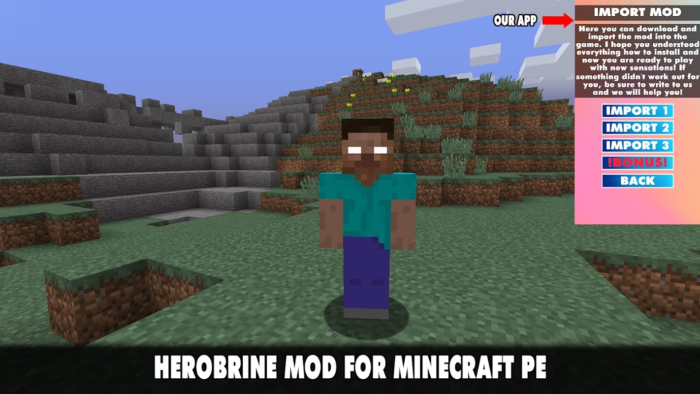 😀🤣If you are tired of the regular version of Minecraft and want to diversify the gameplay, you can install one of our modifications. This is what we talked about above. But this will not be an ordinary addition that adds fabulous animals, new locations or props, but a unique mods. You can download the always updated Herobrine Mod for Minecraft Pocket Edition 2022!🤣😀